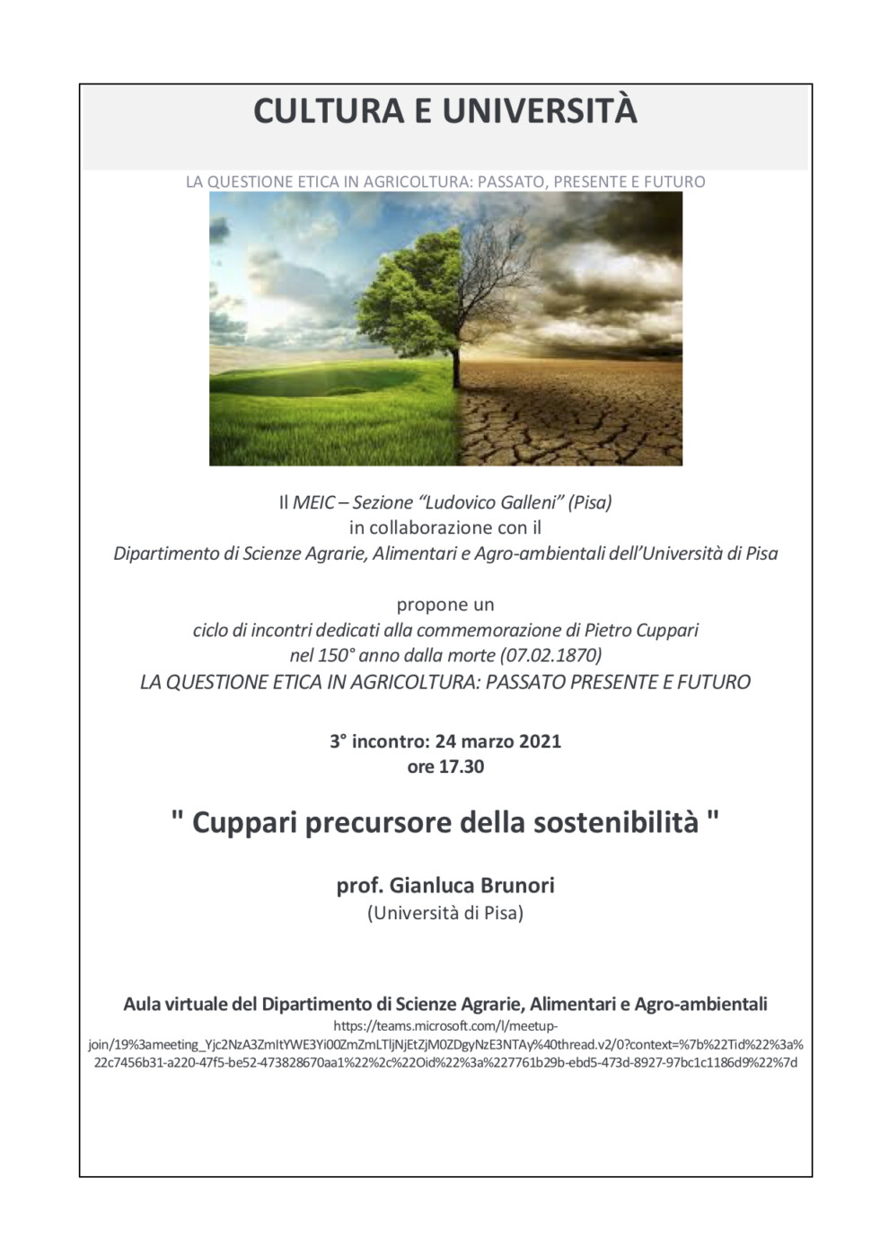 Il Convegno “La Questione Etica in Agricoltura. Passato, presente e futuro” è stato organizzato il 7 febbraio 2020 per celebrare Pietro Cuppari, cofondatore dell’attuale Scuola Agraria pisana, a 150 anni dalla sua morte. Il suo pensiero rappresenta ancora oggi un sorprendente strumento innovativo per la progettazione di sistemi agricoli sostenibili, basati sui concetti di agroecologia, economia circolare, salute umana e ambientale. Il volume degli Atti del Convegno presenta, attraverso la rilettura del pensiero di Cuppari, le problematiche sociali, economiche ed ambientali che sta vivendo l’agricoltura mondiale e nazionale ricercando soluzioni non soltanto ispirate alla tecnica ma soprattutto all’etica preposta a indirizzarle. L’articolazione delle